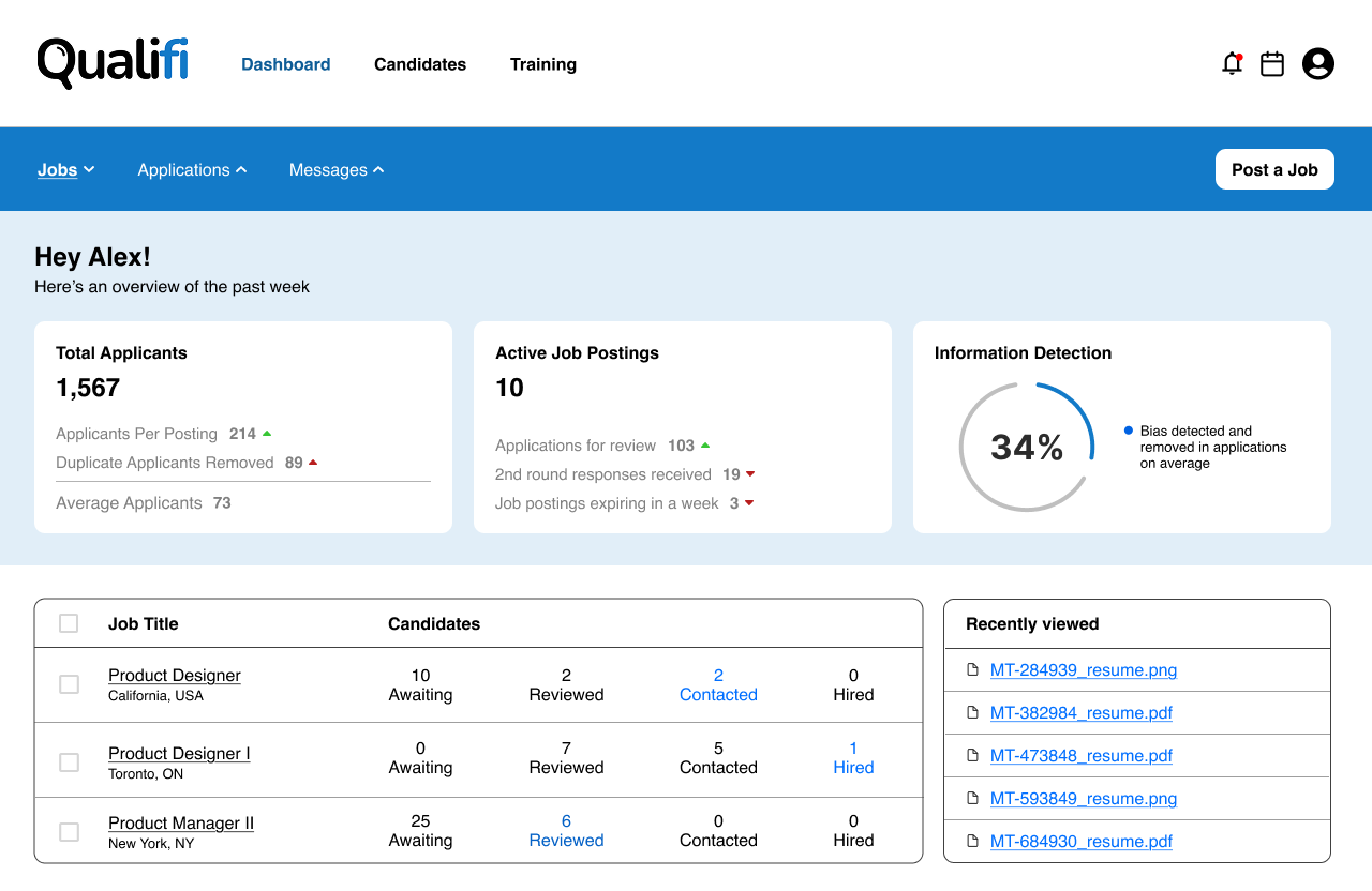This value proposition is demonstrated by our prototype through end-to-end features that support users throughout the process, starting with training tools for hiring managers and a resume builder for job seekers and ending with a platform for interviews. Bias-mitigating tools are also present at all stages, including anonymized applications and no-camera and voice-modulation features during interviews. After pivoting to focusing on a hiring manager’s perspective, we presented our high-fidelity demo: