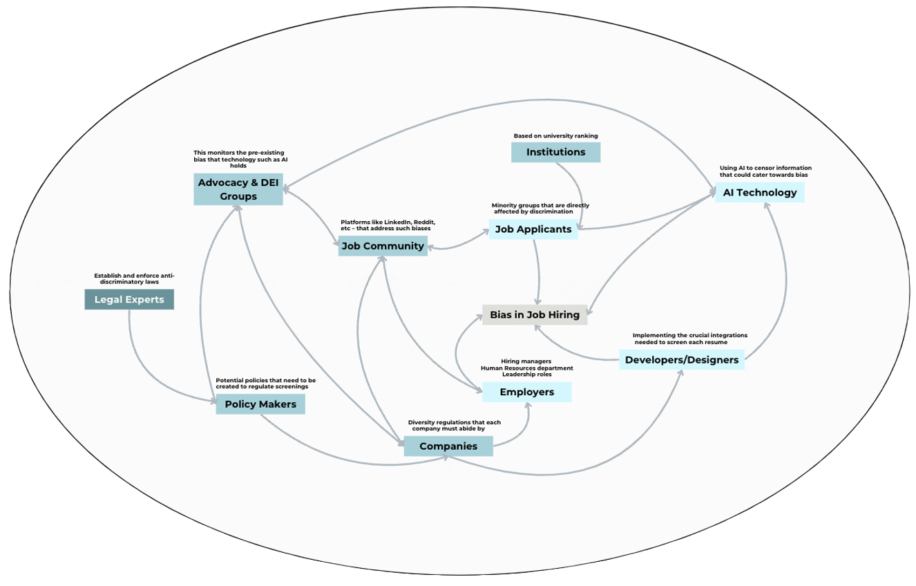 As students actively applying to jobs, we held our own biases, and this led to us focusing more on how the system would look from the point of view of a job seeker, thus considering them the primary target audience. Instead, we began to realize that bias began with hiring managers, and so should our solution. Solving for this stakeholder would indirectly solve for job seekers as well, so we decided to expand our target audience to employers as well.