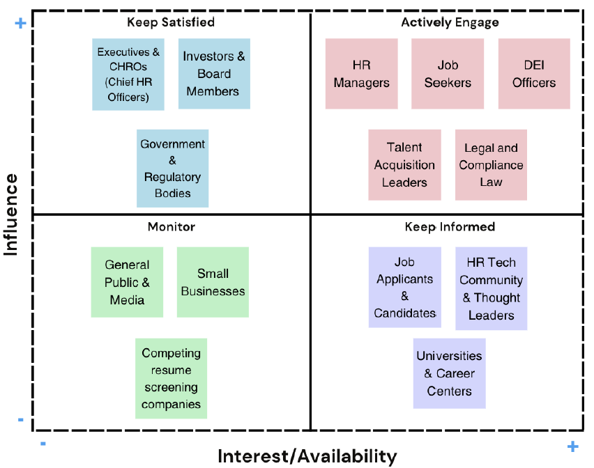 For example, high-influence and high-interest groups such as HR managers, job seekers, DEI officers, and talent acquisition leaders form the foundation of active engagement, helping shape the platform’s functionality and ensuring it directly addresses user needs.
