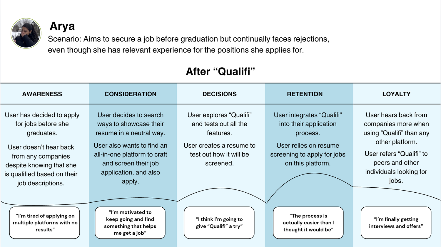 The following user map follows the journey of Arya, who is a job seeker. She was frustrated about rejections, despite being fully confident in her skills and wondered if she is even being screened appropriately due to the lack of communication and transparency from the company’s end.