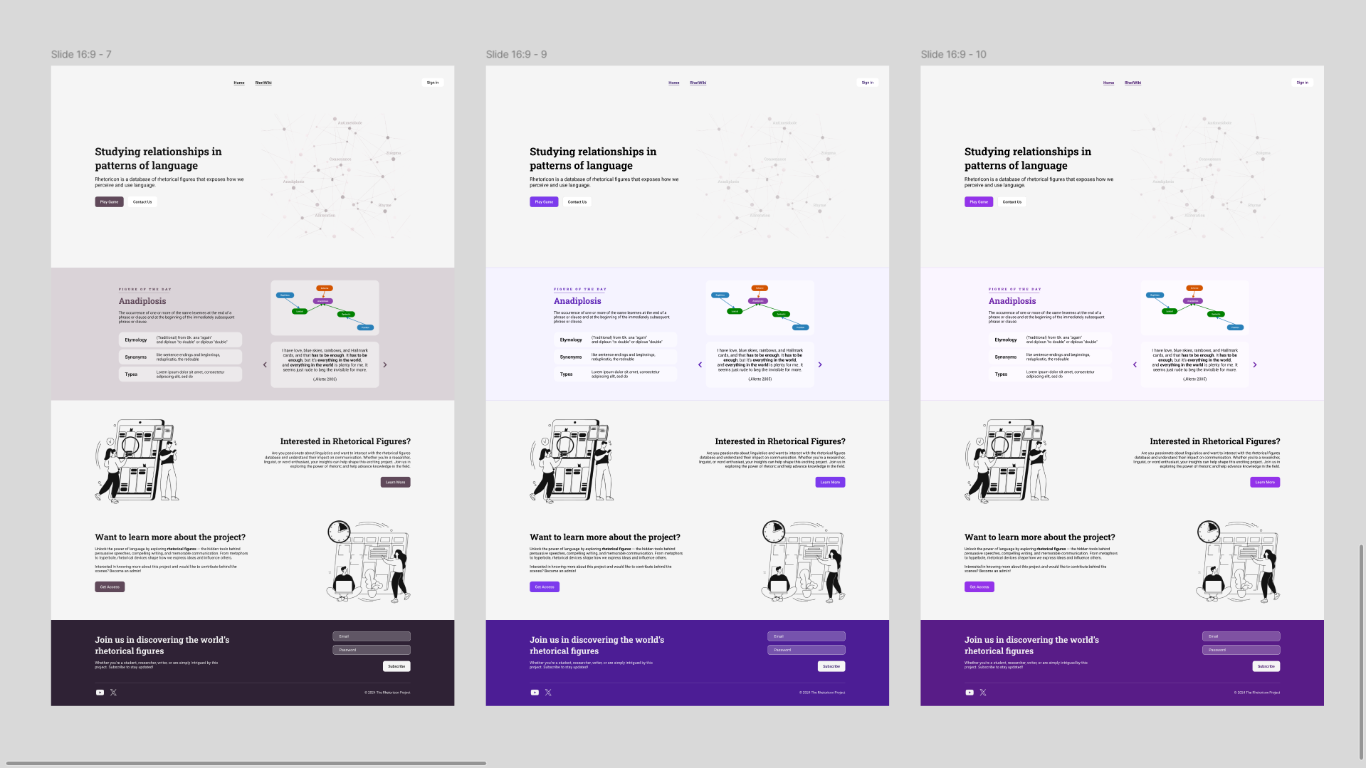 The second round brought better structural clarity but still lacked narrative coherence. I explored multiple layout variations for the main page, incorporating the feedback from our research lead to better express the project’s purpose.